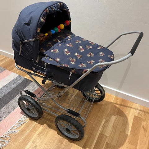 Smuk dukkevogn fra Bayer Chic i Pink Jeans stof med pusletaske ligge underlag og pude+dyne