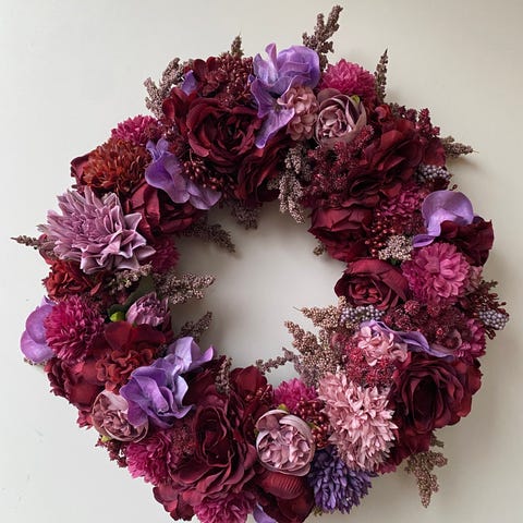 Blomsterkrans i brune nuancer. Ø 33cm. Bundet af kunstige blomster. Med "øje" til ophæng
