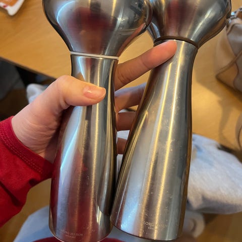 I rustfrit stål. Kværnene har en blank overflade og en ergonomisk form, der gør dem nemme at håndtere. Fyldes ved at trække toppen af.