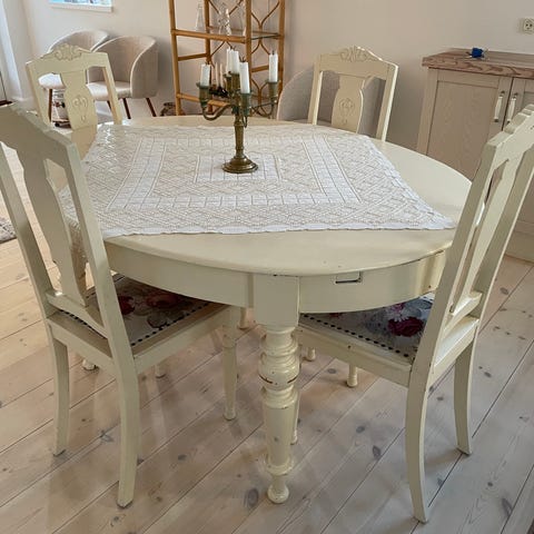 1 bord med hollandsk udtræk og 4 tillægsplader a 50cm. H 75cm L 160cm B 100cm.