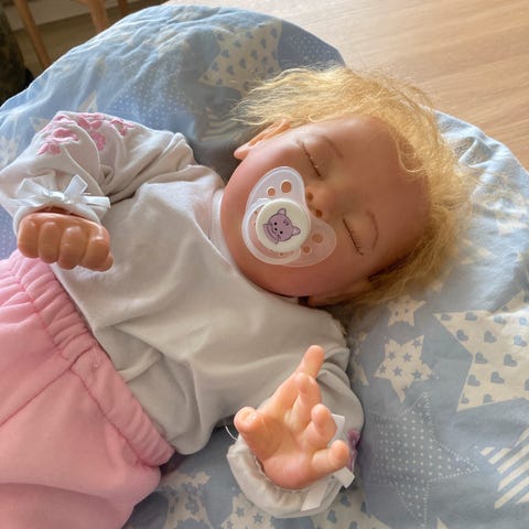 Reborn dukke. Jenny er iklædt en sød lyserød velour sparkedragt