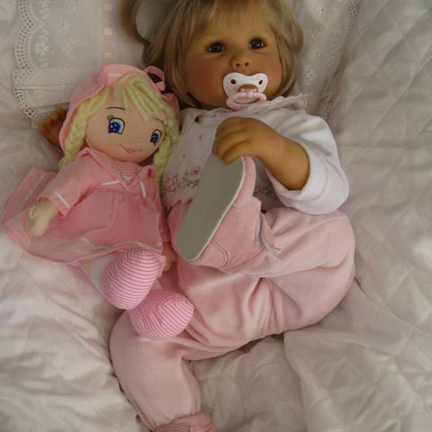 Dukken er ca. 62 cm høj, hoved, arme og ben er af silikone-vinyl, kroppen er af stof.