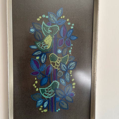 Broderet billede med fugle og fuglehus