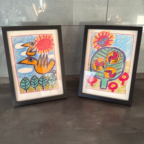 Broderet billede med motiv af fugle omkring et fuglehus. Indeholder detaljerede broderinger af forskellige fuglearter og grene. Indrammet med hvid ramme.