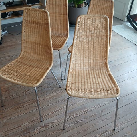 To smukke vintage IKEA Linus spisestole i flet ( rattan) og krom fra 1999, fremstår i flot patineret stand. Et par få fletpinde er gået op. Alle “fødder” er intakte. Stolene er en ganske lille smule vakkelvorne, dog ej forsøgt rettet, da de udelukkende har været brugt til dekoration/ fralægning af tøj.
