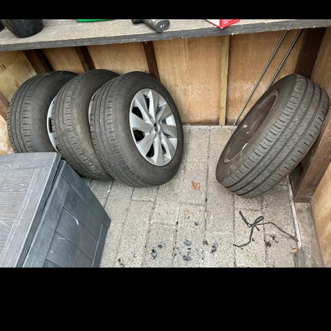 Sælger disse fire stålfælge til Mazda 2. Der er ca. 4 mm mønster på dem, så der er vel til en sommersæson tilbage.