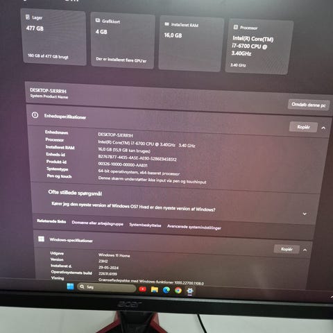 Computeren har Intel i5-8600 CPU med 6 kerner og bundkort fra Asus. Den e fra 2019, har 8 GB DDR4 ram og 1000 GB HDD + 250 GB SSD. Skærmen er 21 eller 27 tommer FullDH skærm, CD/DVD: Ja, OperationSystem: Aktiveret Windows 11 Pro