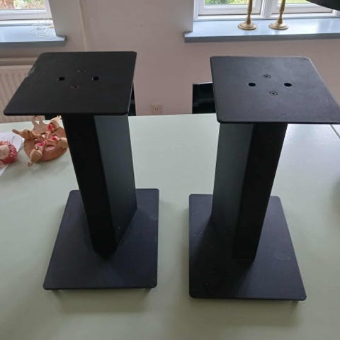 Her får du to flotte, tunge stander til højttalerne. Kabel kan skjules i benen og føres elegant op. De er fyldt med sand for at står solid. Der følger en plade med som kan skrues af/på (hvis man fx vil bruge dem til center højtaler mm.)