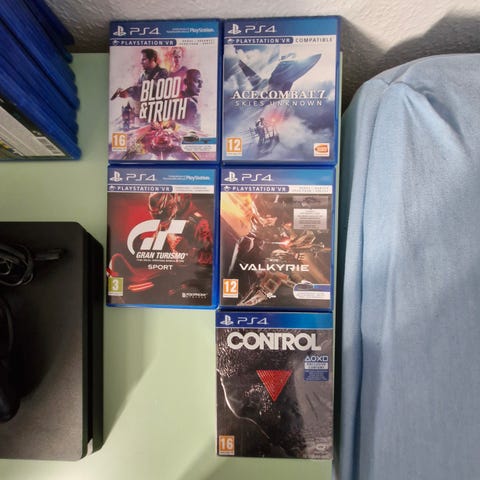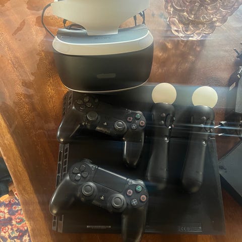 Sony PlayStation 4 spilkonsol med to trådløse controllere. Inkluderer PlayStation VR headset med tilhørende instruktioner og kamera.