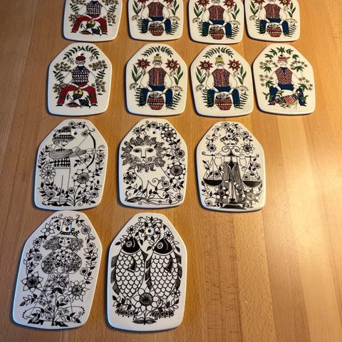 2 flotte og meget dekorative små retro smørbrikker. De har hul, så de kan også anevendes som vægophæng. De kommer fra serien "Saga" fra norske Figgjo Flint. De er i god stand. Prisen på annoncen er for begge.