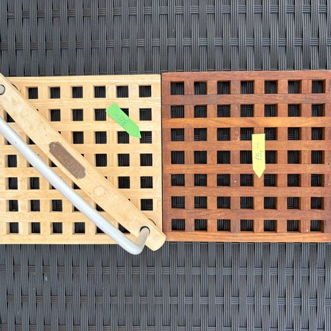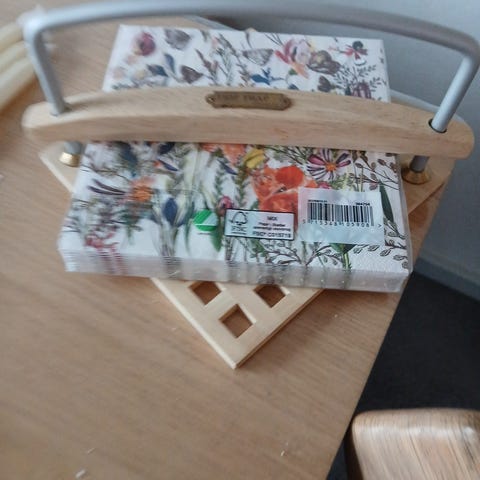 1 køkkenrulle holder med trip trap træ tryk, 1 køkkenrulle holder med trip trap metal emblem, 1 kaffefilter holder med trip trap træ tryk, 1 serviet holder med metal emblem. Sælges samlet