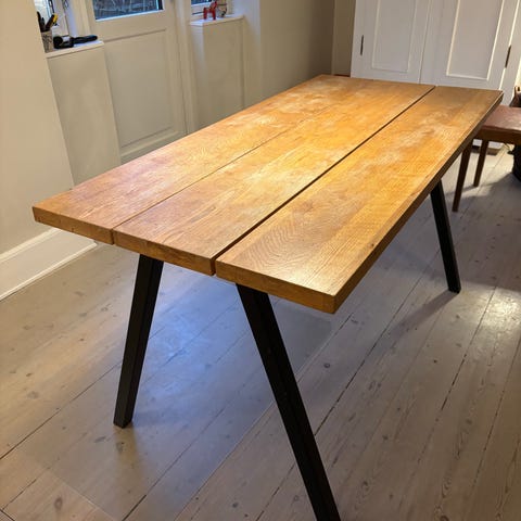 Spisebord i egetræs planker. Sæbebehandlet