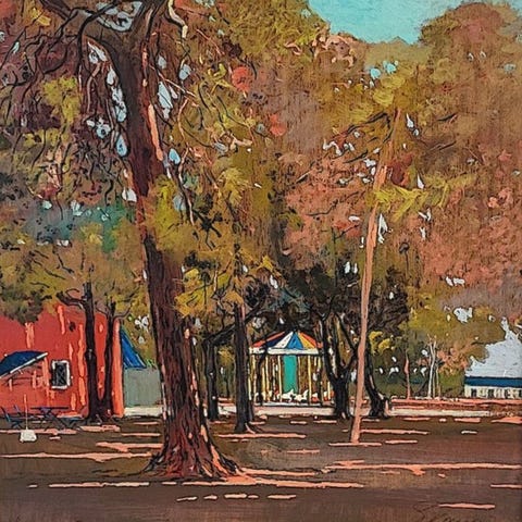 Renato sukra maleri fra 1936, forestiller et landskab med et hus. Maleriet er indrammet og signeret af kunstneren. Kan anvendes som dekorativt kunstværk i hjem eller kontormiljø.