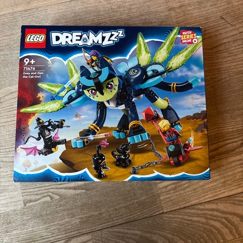LEGO DREAMZzz legetøj sæt med forskellige figurer og et køretøj formet som en skildpadde med hjul. Sættet inkluderer detaljer som en campingvogn med åbent tag, tilbehør som fiskestang og planter, og flere små figurer til leg. Materialet er plastik, og sættet er beregnet til børn.