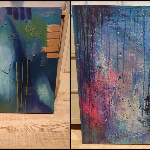 To abstrakte malerier med forskellige farver og motiver. Det ene maleri har sort, hvid og grå nuancer med geometriske former. Det andet maleri har røde, brune og hvide farver med hjerteformede motiver.