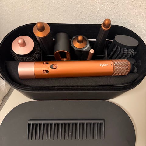 Dyson Airwrap hårstyler sæt med flere tilbehør, herunder børster og varme ruller. Designet til styling af hår med forskellige teksturer og længder. Leveres i en blå opbevaringsetui.