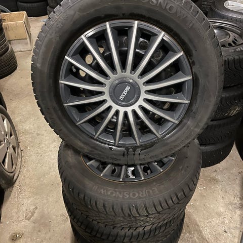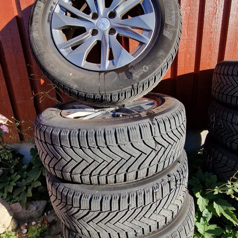 Dæk med fælge i størrelse 215/65R16. Fælgene er sorte og har siddet på en Nissan Juke 2021, men passer på flere biler. Stand er rigtig god