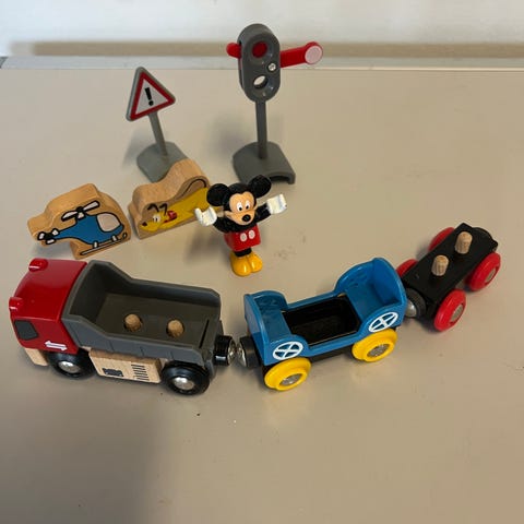 Flexi trax togbanesæt med forskellige dele og tilbehør, herunder skinner, broer og tunneller. Sættet indeholder flere farverige plastikdele, der kan samles til en komplet togbane. Egnet til børn som legetøj.