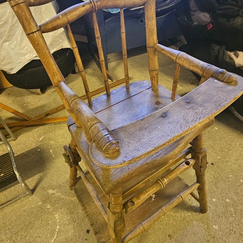 Fin gammel børnestol med hjerte i ryglæn og godt sæde, som også en voksen kan sidde på.