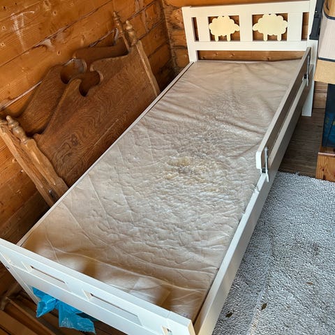 IKEA juniorseng til børn. Sengens materiale er træ med hvid finish. Sengen er designet til børn og har en enkel, funktionel konstruktion. Sengen viser tegn på brug, herunder mindre skader på træet. Egnet til børneværelse som juniorseng.