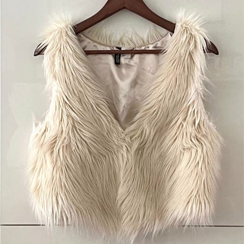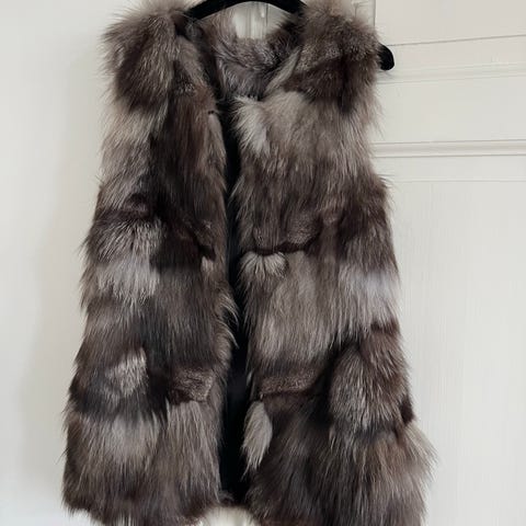 Pelsvest fra “This is who I am”. Stadig fin - men brugt. Der er et hul under den ene lomme (se foto, hvor området er markeret med pil og cirkel). Tænker godt det kan sys - har ikke selv forsøgt.
