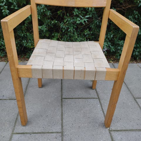Klassisk Hans J Wegner - model Koldinghus- armstol i massiv træ med blåt polstret sæde i uld.