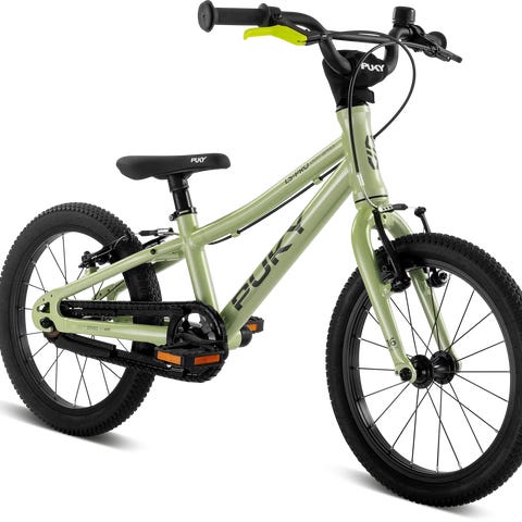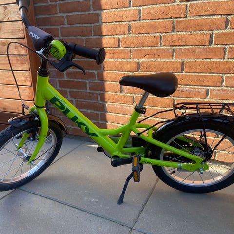 Puky LS Pro 16 børnecykel med 16 tommer hjul, blågrå farve, egnet til børn. Købt i marts 2024. Kun 5,5 kg, nem for børn at håndtere. Cyklen har støttefod og skærme inkluderet.