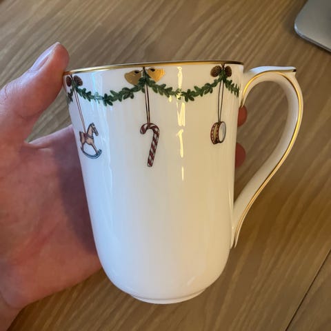 Royal Copenhagen julekrus i porcelæn med julemotiv. Sættet indeholder 2 krus med hank og dekoration af julepynt. Størrelse 33 cl.