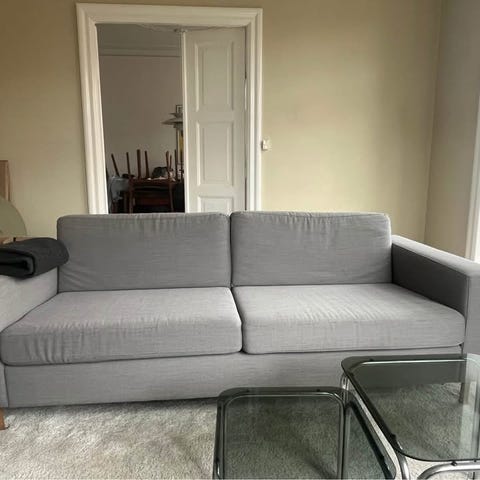 The sofa is approx. 1 1/2 years old and in very good condition and we think the colour is called either Beige but we are not entirely sure :D. We bought it half a year ago from a lady who had the sofa 1 year and barely used it. You can also store things in the "puf".