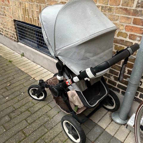 Bugaboo barnevogn i sort med justerbart håndtag og stor kaleche. Vognen har solide hjul og rummelig siddeplads.