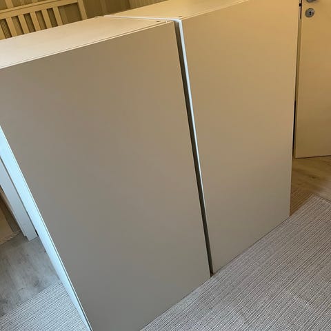 IKEA Platsa med Sannidals hvide låger. Skabene er 180 i højden, men der er yderligere 3 overskabe af 40 cm.