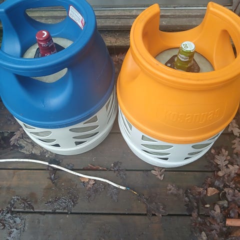 2 stk 10 kg letvægts gasflasker med gas. Der er 8 kg i den ene, og 5,5 kg i den anden.
