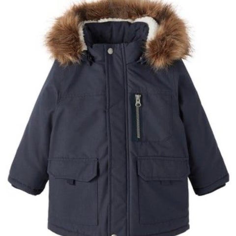 Helt ny , super fin parkajakke. Str.(14-16 år, 170cm) opretstående krave, praktiske lommer, forlommer med klap, 2-vejs lynlås ,hætten kan tages af. Mørkeblå (dark blue).