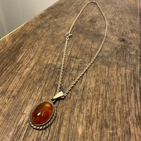 Elegant Halssmykke. Smal sølvring og inden i denne hænger en cabochonsleben lilla sten - formodentlig ametyst. Stemplet med hvad der ser ud til at være 925S + bogstaver (CO?). Den yderste ring 3cm i diameter Længde 4cm. Pris kr 235