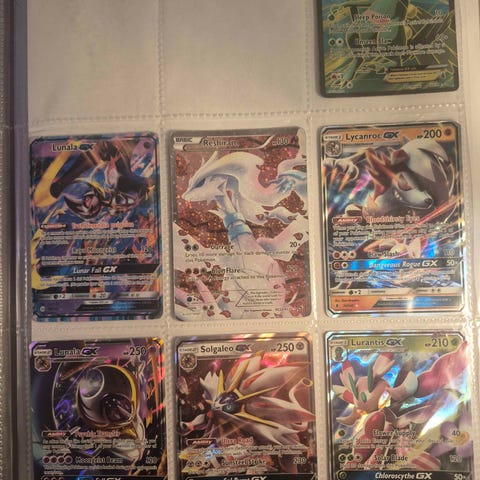 Samling af Pokémon kort med forskellige kort fra forskellige serier og typer. Kortene vises i plastlommer til opbevaring og beskyttelse. Egnet til samlere og fans af Pokémon kortspillet.