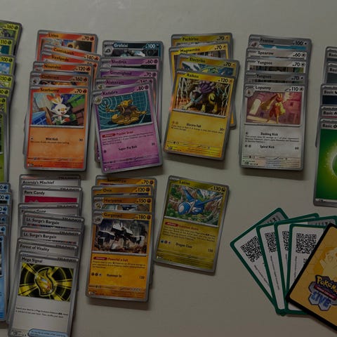 Samling af Pokémon kort i forskellige modeller og typer. Kortene er i plastlommer for beskyttelse og indeholder forskellige Pokémon karakterer og angreb. Velegnet til samlere og spillere af Pokémon kortspillet.