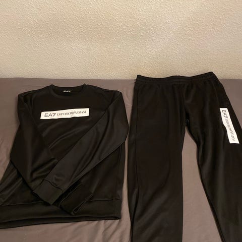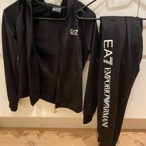 Emporio Armani EA7 træningssæt i størrelse XS. Sættet består af en sort jakke med lynlås og hætte samt matchende sorte bukser med elastik i taljen. Materialet er ikke specificeret. Designet inkluderer logo og mærkning på både jakke og bukser.