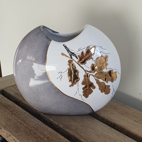 Sød lille vase i med hvid og grøn med guld kant om.