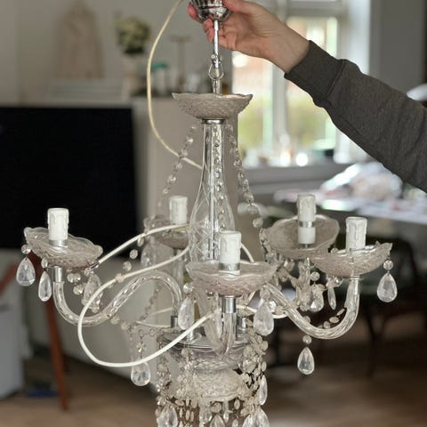 Flot lysekrone med prismer - skal blot støves af. Til 5 pærer. Højde ca. 60 cm.