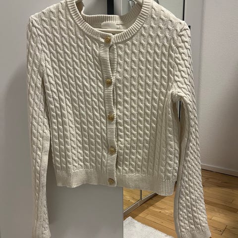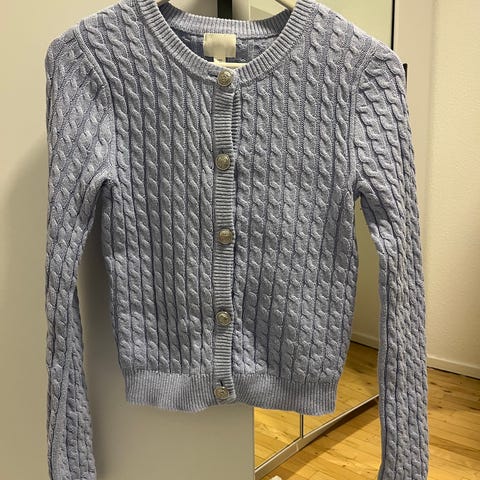 H&M cardigan i størrelse M til kvinder. Fremstillet i bomuld med en grå farve. Cardiganen har en knappelukning foran og et flettet mønster i stoffet.