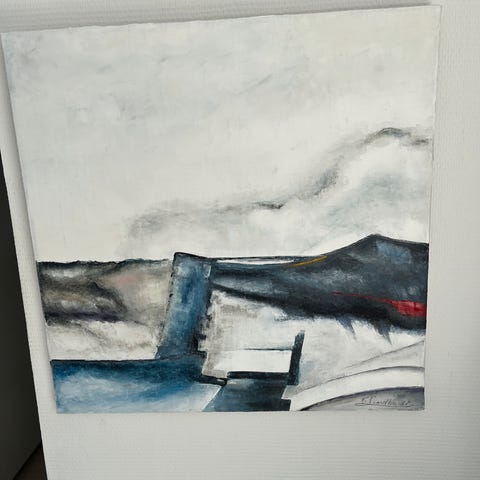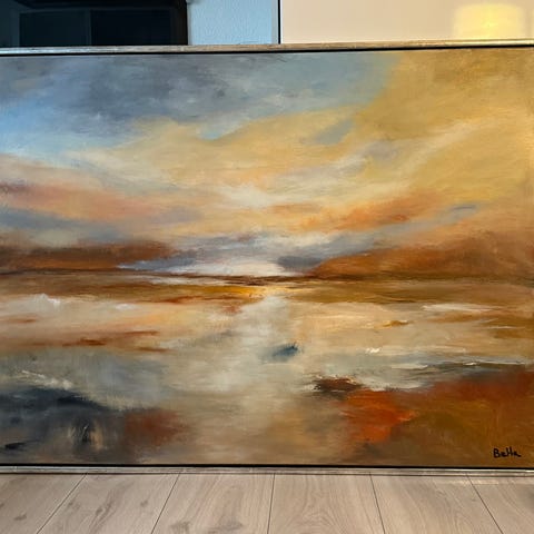 Abstrakt maleri med farverige elementer, der skildrer et landskab med horisontale linjer og forskellige teksturer. Kunstværket anvender en blanding af blå, grønne, gule, røde og sorte farver på lærred.