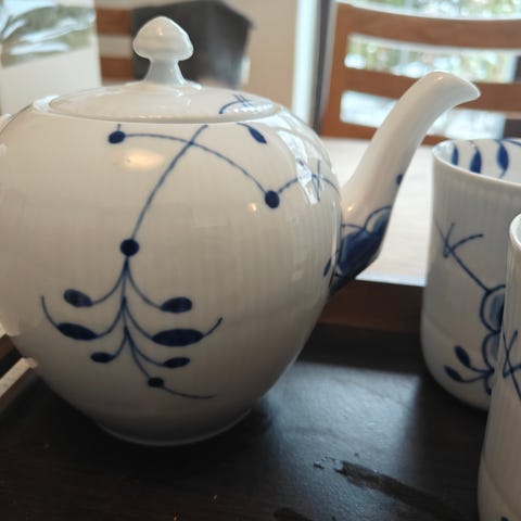 Royal Copenhagen Musselmalet riflet tekande i porcelæn. Tekanden har låg og hank, og er designet til brug ved servering af te.