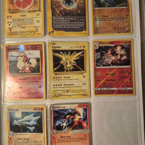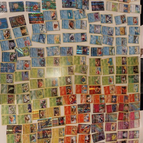 Samling af Pokemon samlekort med forskellige motiver og designs. Kortene er velegnede til samling eller spil.