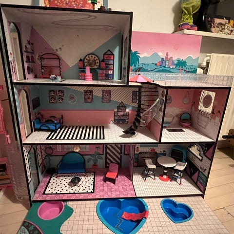 L.O.L. Surprise! Dukkehus indeholder et dukkehus med flere etager, møbler og små figurer. Dukkehuset har forskellige rum indrettet med detaljerede møbler og tilbehør, der kan bruges til leg og indretning. Legetøjet er designet til børn i 4 -9 år alderen og kan stimulere kreativ leg og fantasi.