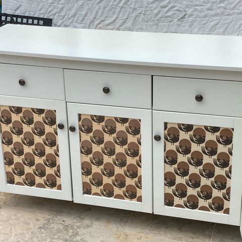 Hvid kommode med synlige brugsspor som ses på billederne. Bunden af skufferne er stribede, og bunden af den nederste skuffe sidder lidt løst. Møblet fungerer derudover fint.