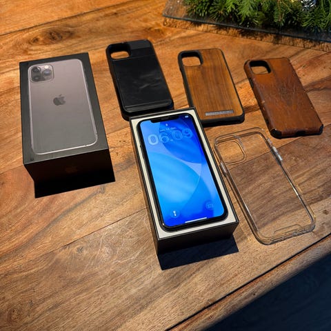 Apple iPhone 11 Pro med 64 GB lagringskapacitet og batterikapaciteten er på 86%. Smartphone i farven Midnatsgrøn og med flere kameraer på bagsiden. Leveres i original emballage med tilbehør inklusive helt nye og ubrugte høretelefoner og et uåbnet panserglas fra Holdit.