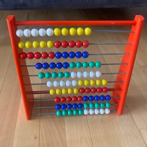 Træ kugleramme med 10 rækker farvede perler i regnbuefarver. Kugleramme er designet til at hjælpe med grundlæggende matematiske øvelser og tællefærdigheder. Den har en træramme og metalstænger, hvorpå perlerne er trukket. Dimensionerne er cirka 30 cm i bredde og 40 cm i højde.