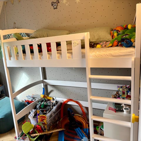 Hoppekids ECO Dream Halvhøj køjeseng med rutsjebane i hvid. Den er 163 lang, 80 bred og 106 høj (uden rutsjebanen på).