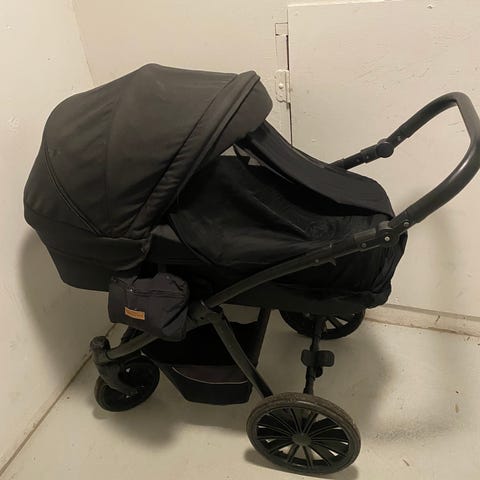 Barnevognen har et liggemål på 82 cm, og kan slås sammen, så den let kan komme med i bil.