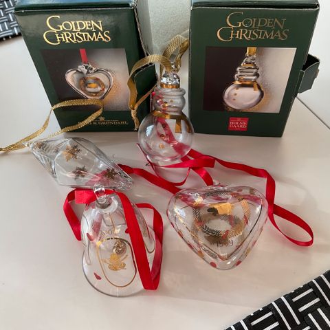Holmegaard Golden Christmas julepynt til sæsonen jul. Den ene er lavet af glas med et mønster i guld og røde hjerter. Den anden er lavet i glas med guld dekoration.